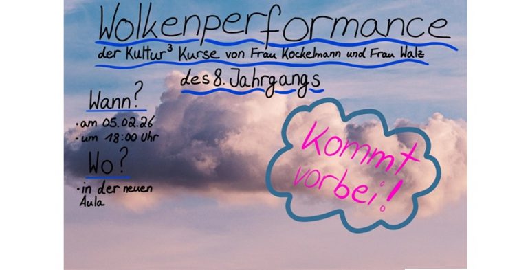 Einladung zur Performance der Kultur³-Kurse des Jahrgangs 8 “Wolken (am) Stück” am 05.02.2026 um 18 Uhr Wolken,eine Minute lang nicht hingeschaut,schon sind sie da, plötzlich, weiß,blühend ja, aber wenig handfest –ein wenig Feuchtigkeit, hoch oben,etwas Unmerkliches, das auf der Haut