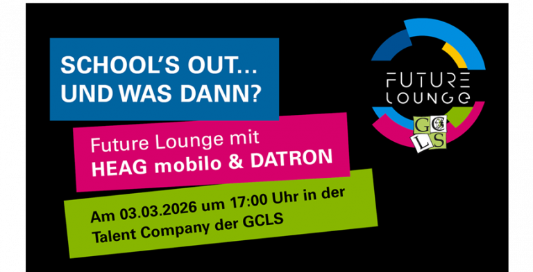 Future Lounge:School’s out und was dann?Finde Deinen Weg – live mit HEAG mobilo & DATRON Am Dienstag, 03.03.2026, öffnet um 17:00 Uhr die Future Lounge in der Talent Company der GCLS für Dich und Deine Eltern – keine Messe, kein Vortrag,