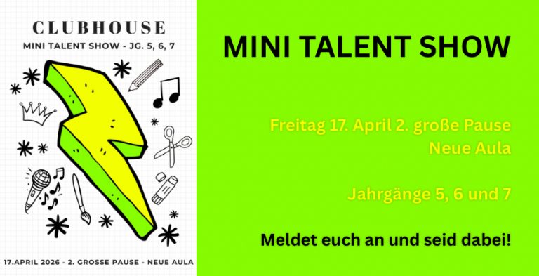 Wir hatten im ersten Halbjahr viele schöne Clubhouse-Sessions: Live-Musik, Musikvideos, Kostümwettbewerbe, Spielpausen, FemFest-Lady-Disko, Auszeit-Session… Im zweiten Halbjahr wird es ein bisschen neu: Wir informieren euch über den Schaukasten unterm Vertretungsplan-Screen in der Pausenhalle über upcoming Clubhouse-Inhalte und werden die Pausen