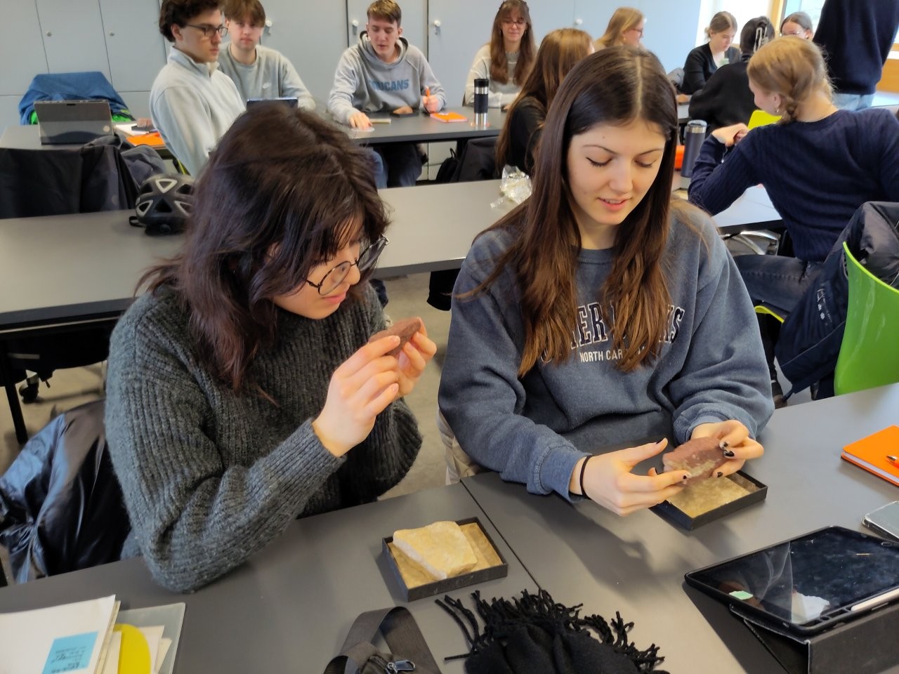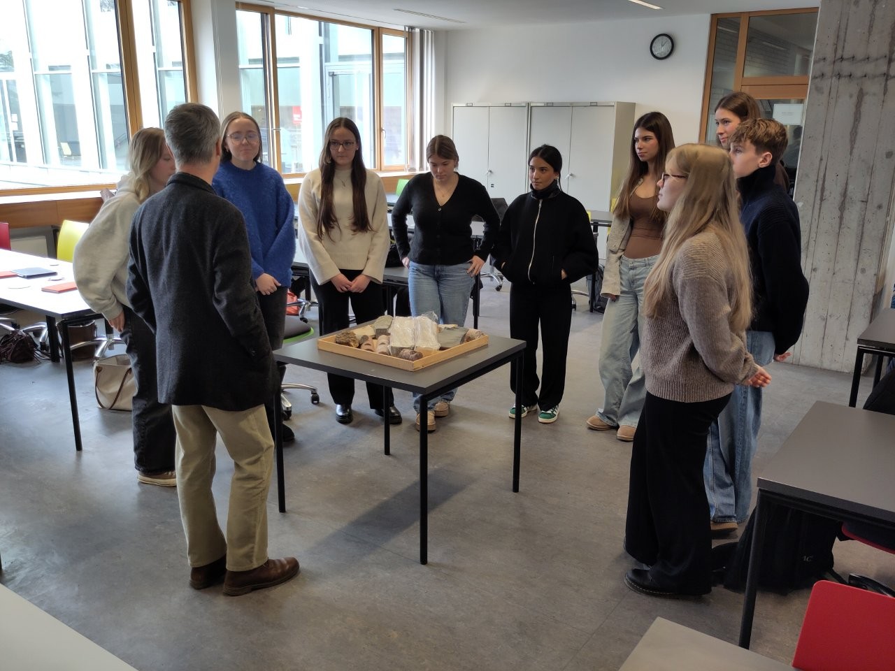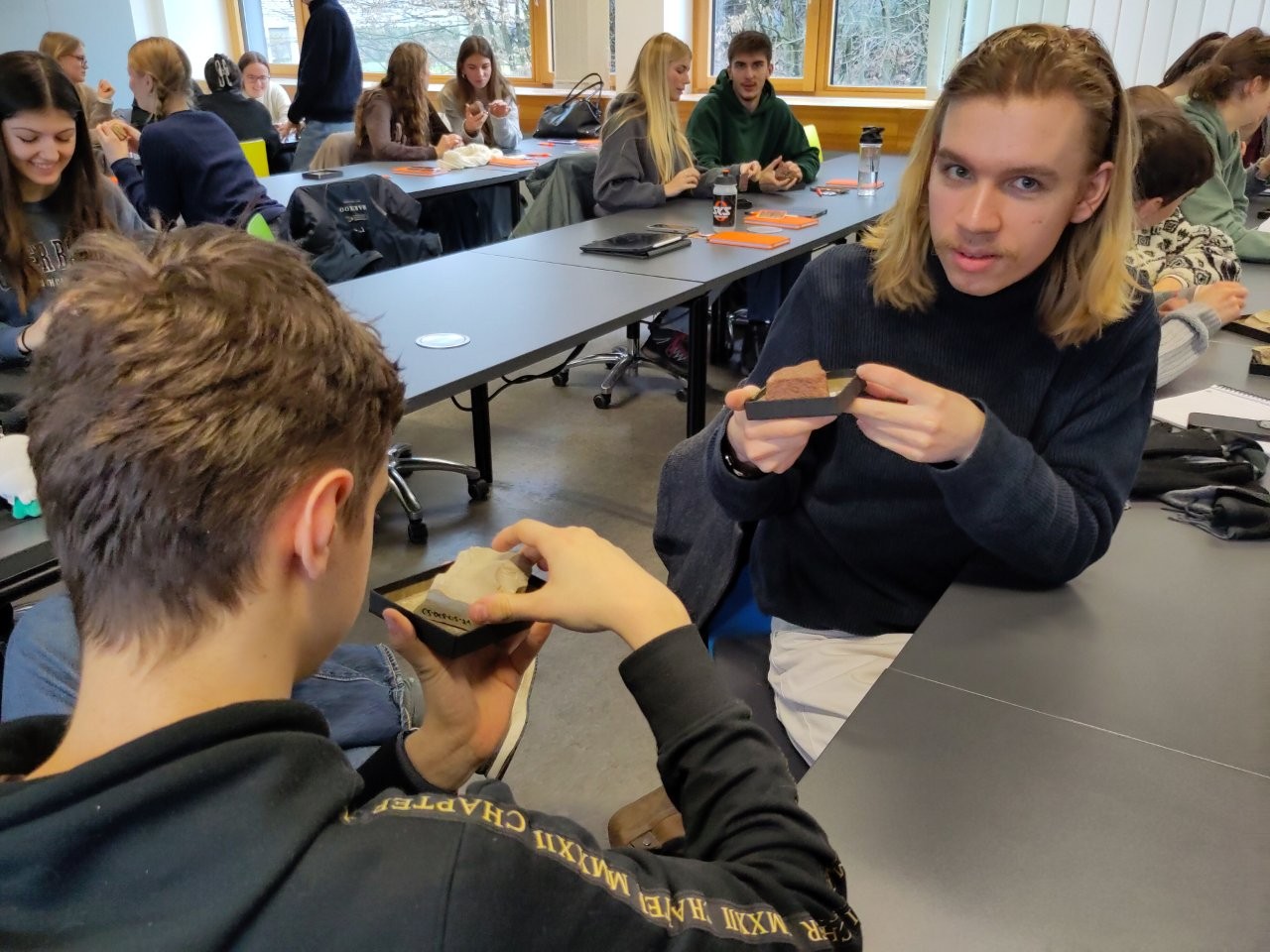 Auch der Vortrag von Prof. Hinderer zur angewandten Sedimentologie begeisterte. Anhand echter Gesteinsproben wurden Sedimentgesteine wie Sandstein, feinkörniger Sandstein und Kalkstein gemeinsam bestimmt. In einem lebendigen Dialog band er die Kurse immer wieder aktiv ein. Anschaulich stellte er Methoden vor, mit denen Fachleute Gesteine unterscheiden – etwa durch Ritzen oder Säurebetröpfeln – und erklärte, wie man Schichtgesteine „lesen“ kann. Besonders eindrucksvoll waren die Bohrkerne, die die Schülerinnen und Schüler selbst in die Hand nehmen und genau untersuchen durften. Mit dem Einblick in das DFG-Projekt „Bad Waldsee“ wurde deutlich, wie Forschung hilft, vergangene Umweltbedingungen zu rekonstruieren – und damit auch heutige Entwicklungen besser zu verstehen.