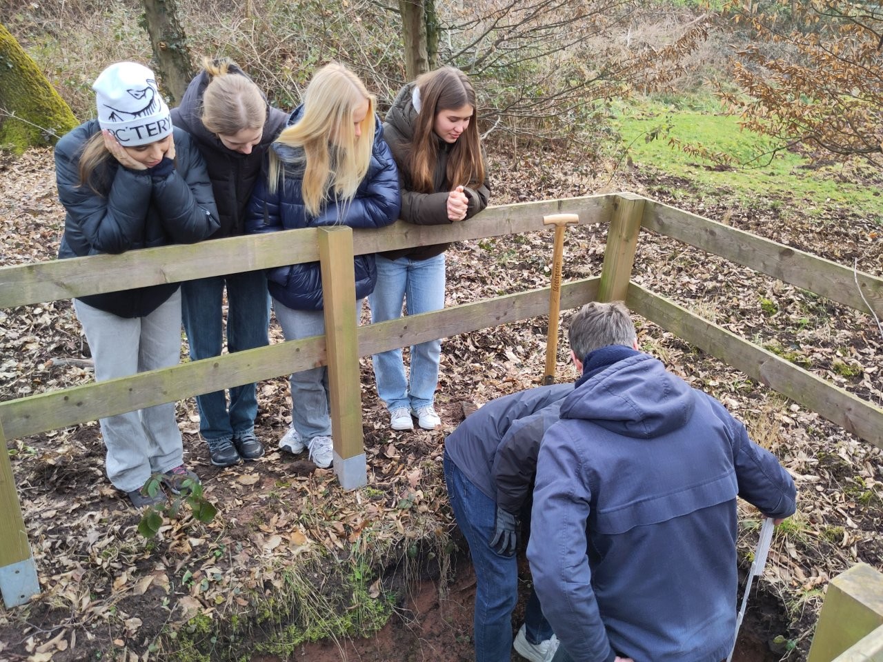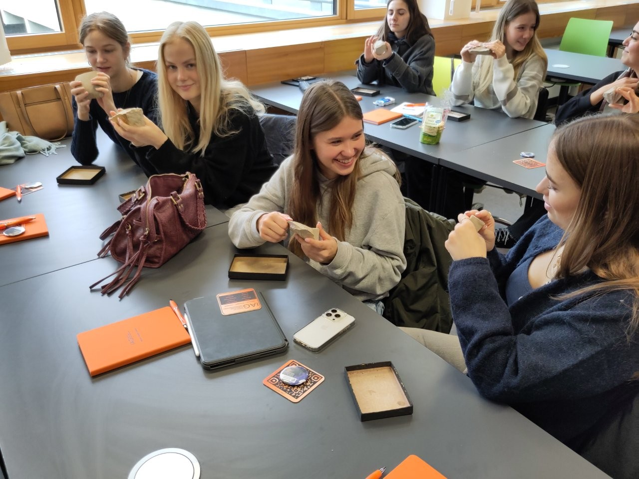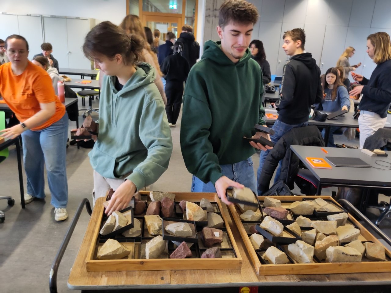 Auch der Vortrag von Prof. Hinderer zur angewandten Sedimentologie begeisterte. Anhand echter Gesteinsproben wurden Sedimentgesteine wie Sandstein, feinkörniger Sandstein und Kalkstein gemeinsam bestimmt. In einem lebendigen Dialog band er die Kurse immer wieder aktiv ein. Anschaulich stellte er Methoden vor, mit denen Fachleute Gesteine unterscheiden – etwa durch Ritzen oder Säurebetröpfeln – und erklärte, wie man Schichtgesteine „lesen“ kann. Besonders eindrucksvoll waren die Bohrkerne, die die Schülerinnen und Schüler selbst in die Hand nehmen und genau untersuchen durften. Mit dem Einblick in das DFG-Projekt „Bad Waldsee“ wurde deutlich, wie Forschung hilft, vergangene Umweltbedingungen zu rekonstruieren – und damit auch heutige Entwicklungen besser zu verstehen.